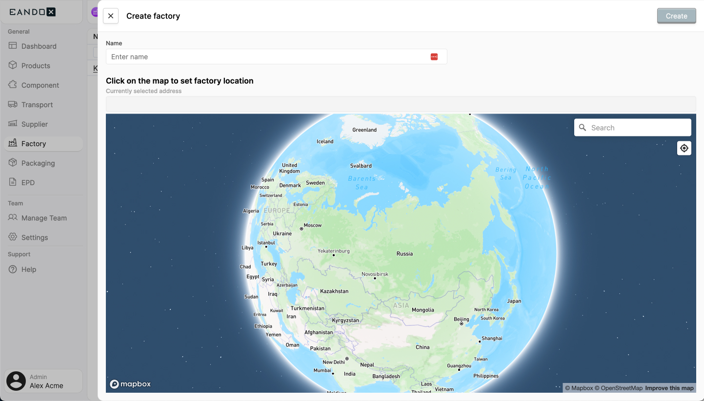 | Factory location | The location of the factory. You can use the search input to search for the address. |