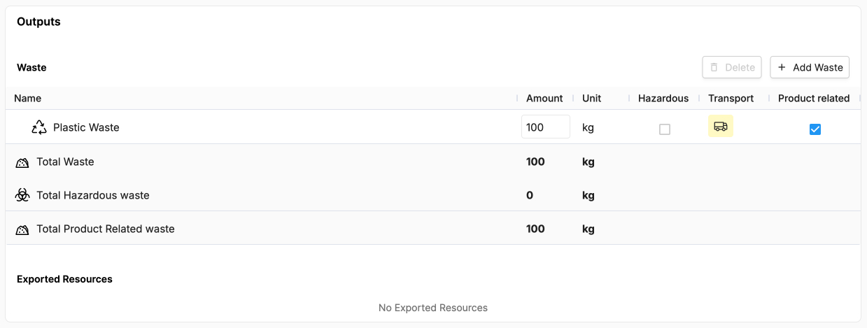 Click the + Add waste in the top right of the box. This will open a sidepanel where you can select an output category, and then add a new output.