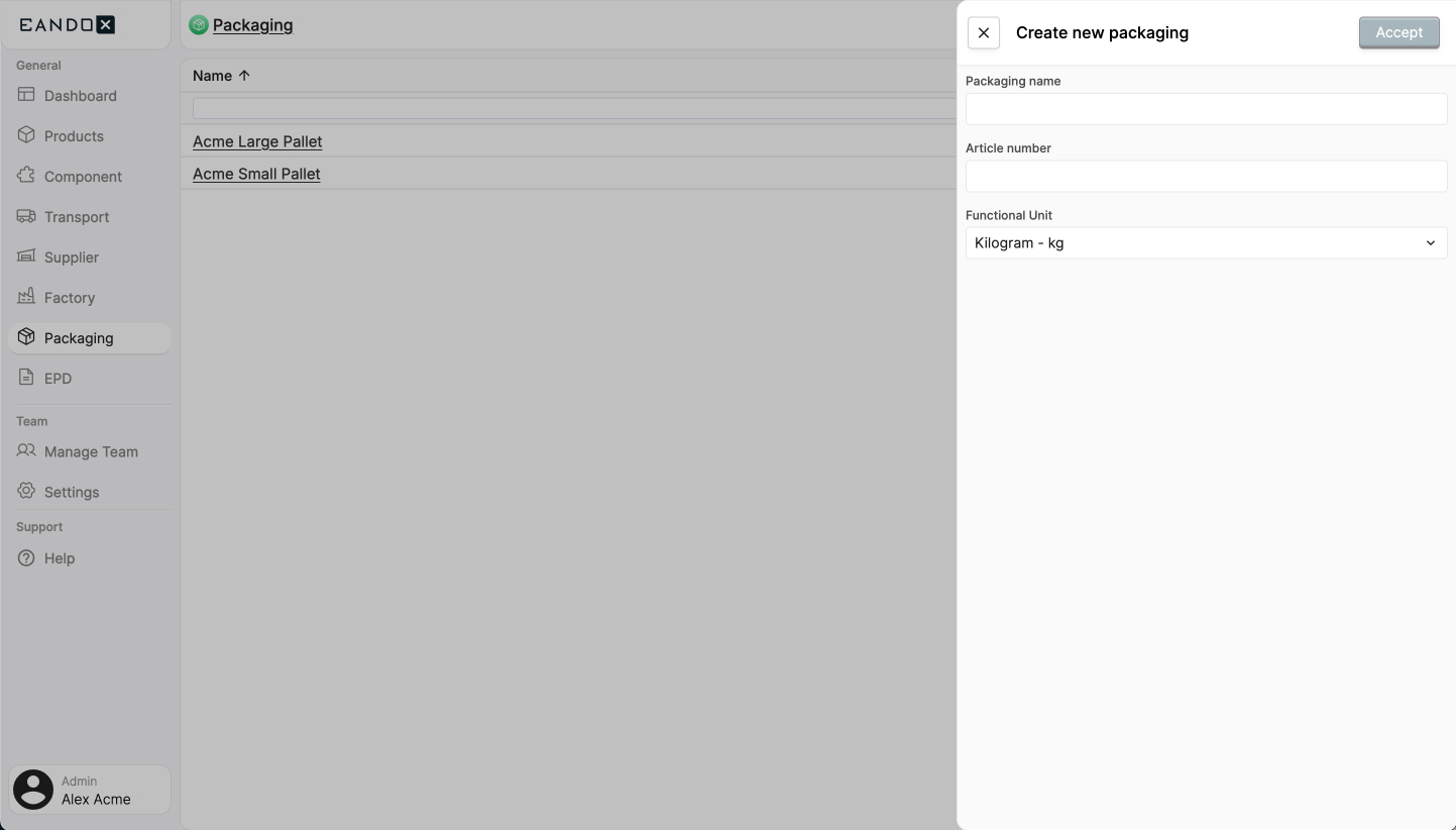 This is a hands-on guide for creating packaging entities in EandoX. For understanding packaging data and its impact on LCA calculations, see the Packaging data article.