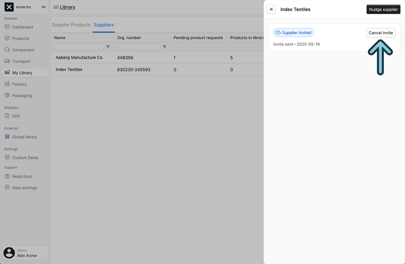 If you need to cancel an invitation that hasn't been accepted yet, you can do so from the supplier's sidepanel. Look for the Cancel invite button in the top right corner of the panel.