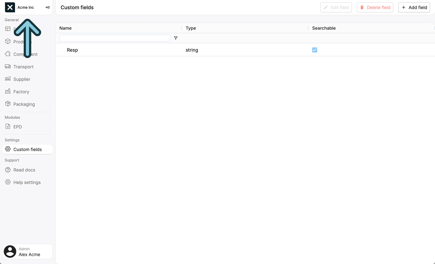 To manage your company settings, click on the company name in the top left corner: