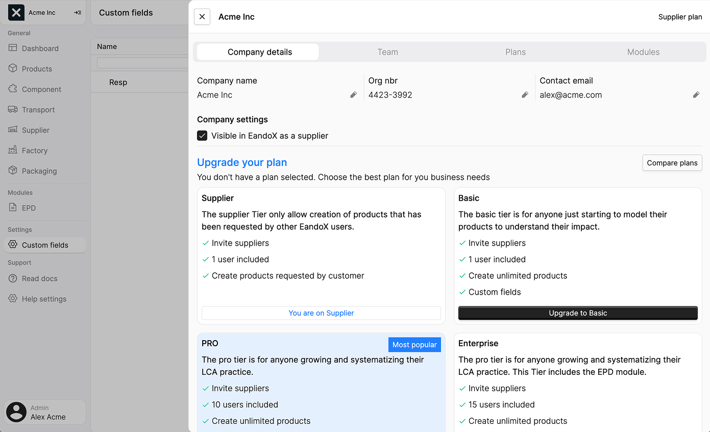 Here you can see what plan you are currently on, and edit your company details: