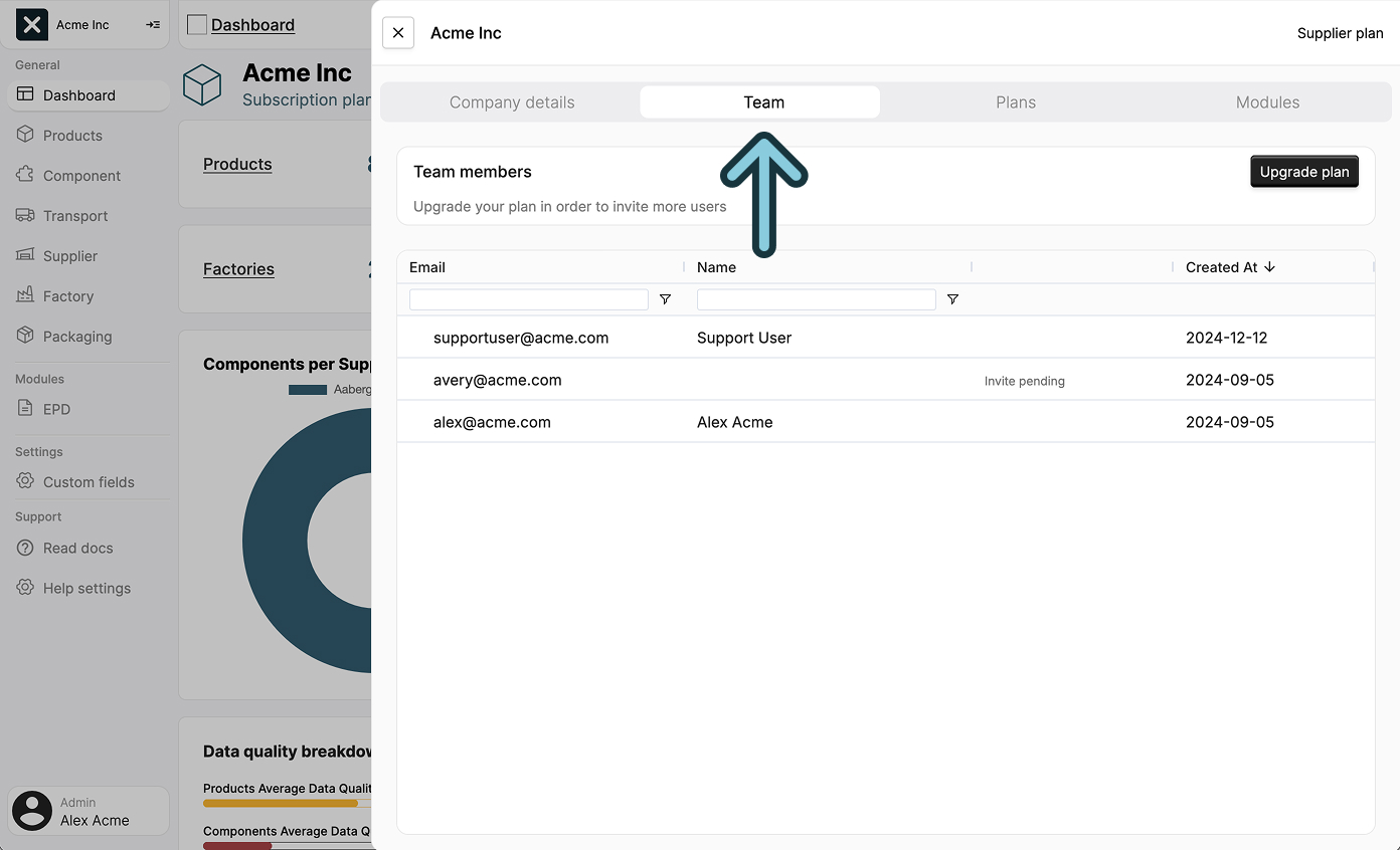 The company settings page allows you to manage your company details, team members plans and subscriptions.